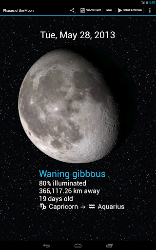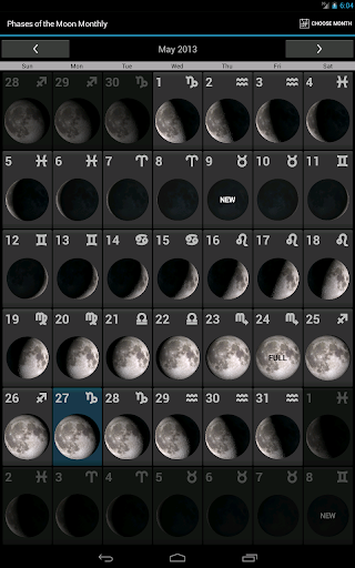 Todo ello representado en una interfaz elegante. Asimismo, hay un calendario por meses en que se puede ver como la Luna varía cada mes y puedes seleccionar el día que quieras ver tanto si es del pasado como del futuro.